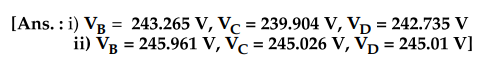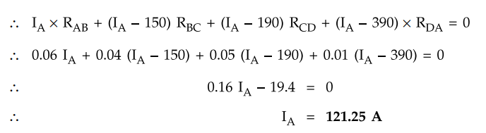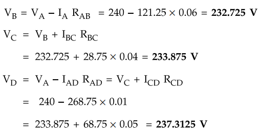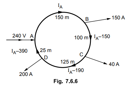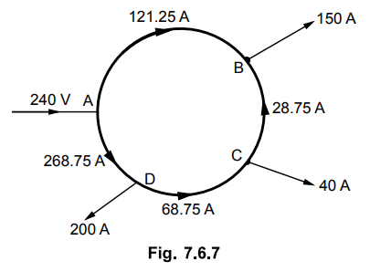 7. A DC ring main A, B, C, D, A is fed from point A from 250 V supply