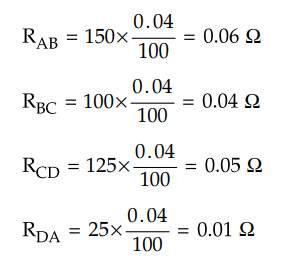 AB = 0.2 ohms, BC = 0.018 ohms, CD = 0.025 ohms and DA = 0.02 ohms.