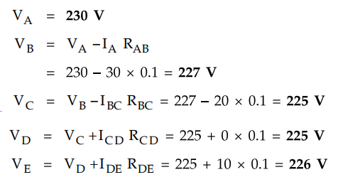 A two wire dc ring main distributor ABCDEA is fed at point A with 230 V supply.