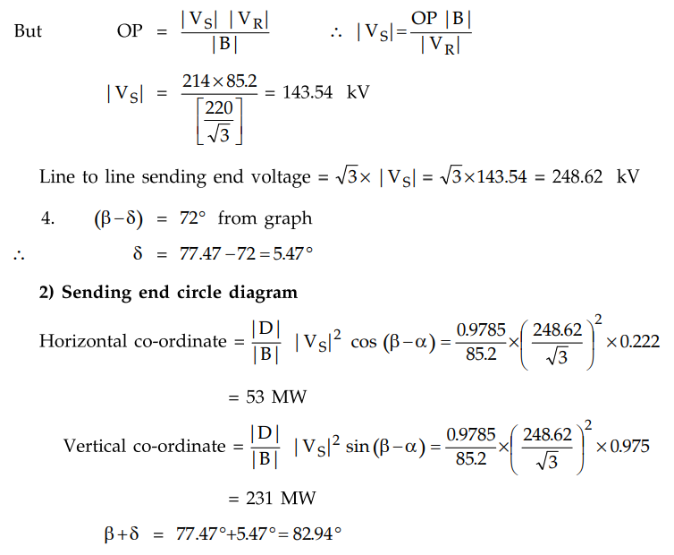 Example 2.17.2 The constants of a three phase line are A = 0.9Z2° and B = 140Z 70° ohms per phase. The line delivers 60 MVA at 132 kV and 0.8 pf lagging. Draw power circle diagrams and find (a) sending end voltage and power angle (b) the maximum power which the line can deliver with the above values of sending and receiving end voltage (c) the sending end power and power factor (d) line losses.