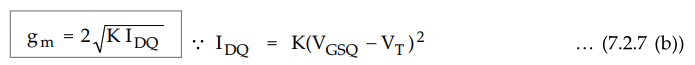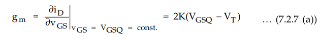 = Id / Vgs = 2K (VGSQ - VT) ...(7.2.6)