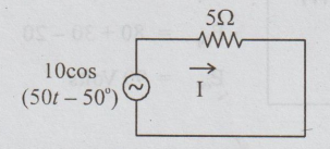 circuit with 5 Ohms resistor across a voltage source of 10cos(50t - 50°) Volts.