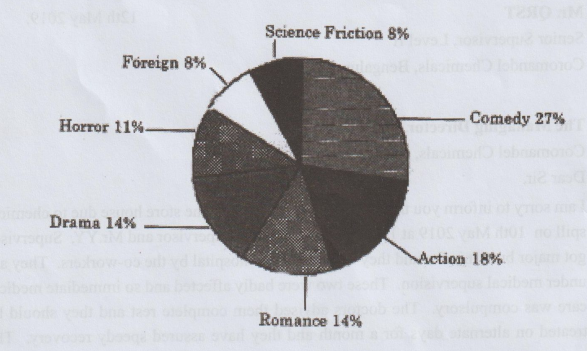 Ans: The following findings have been collected from the survey conducted among the youth about their favorite movie genre. The maximum percentage of youths prefers comedy to refresh them and they form 27% of movie goers. Comedy relieves their stress and they feel light hearted after watching the movie. It prepares them to work from home and meet challenges they face in their jobs. The youths who are fascinated with comedy movies say that this kind of movie is befitting to watch along with their family members. Action movies stand second and next to comedy since they are thrilling to watch. The youths who are passionate about action movies forget themselves in the movie. They say that the action movies make them energetic and agile. They forget their worries. 18% of youths watch action movies. The preference of youths for romance and drama stand equal. The youths feel that the romance and drama are full of emotional scenes and it becomes heavy at times. There is repetition of some scenes in the said genres and hence only 14% of youths watch romance and drama. 11% of youths watch horror movies because they are not scared of watching and 8% of youths watch movies of foreign countries since they know the plot, locale and characterization of movies directed in their homeland. The youths who watch science fiction constitute 8% and it is the least sought after choice like movies of foreign countries. The choice of genres differs from person to person. It depends on people's tastes and temperaments. The pie-chart is the result of the findings obtained from the survey.