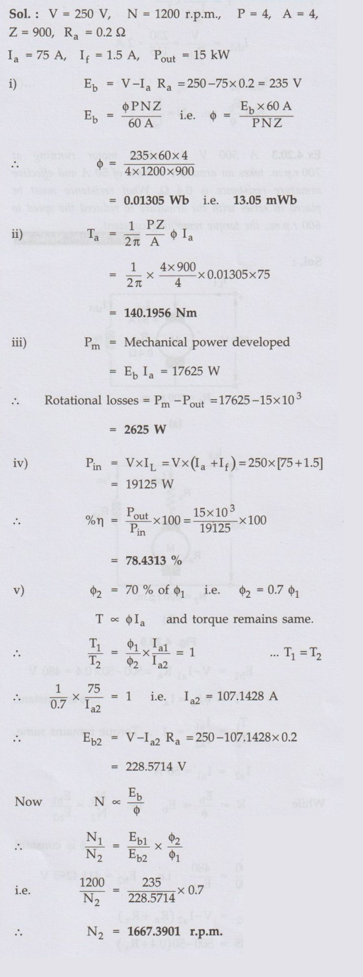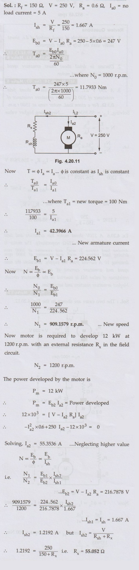 4. A 250 V, 10 h.p., d.c. shunt motor with Ra = 0.4 Ω and Rsh = 100 Ω, runs at 1000 r.p.m. on full load. Efficiency on full load is 85 %. If speed is to be raised to 1400 r.p.m. keeping load constant, determine extra resistance to be added in the field circuit. Assume 1 h.p = 735.5 watts.