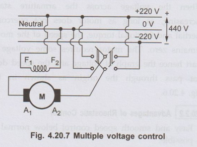 • The Fig. 4.20.7 shows a control of motor by two different working voltages which can be applied to it with the help of switch gear.