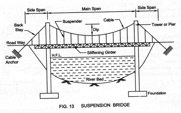suspension bridge has the following components: Two flexible cables, Back stay,