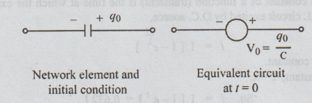 Draw the equivalent circuit at t=0+ for a capacitor with initial charge of q0.