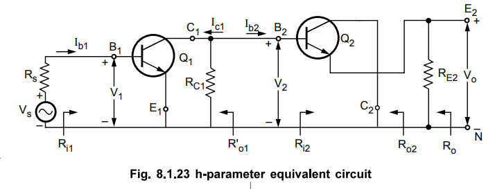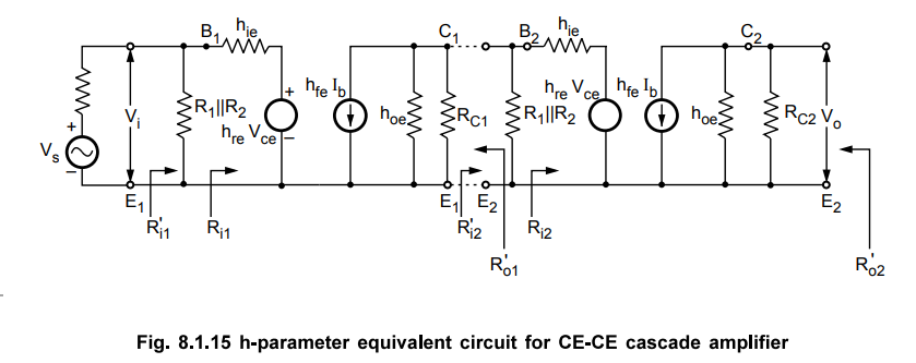 • Assuming all capacitors arbitrarily large and act as a short circuit for a.c. signal we can draw h-parameter equivalent circuit for CE-CE cascade amplifier, as shown in Fig. 8.1.14.