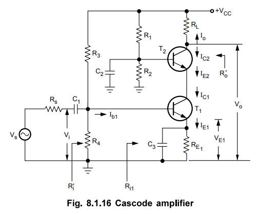 • The cascode amplifier consists of a common emitter amplifier stage in series with a common base amplifier stage as shown in the Fig. 8.1.16. It is one approach to solve the low impedance problem of a common base circuit. Transistor, T-j and its associated components operate as a common emitter amplifier stage, while the circuit of T2 functions as a common base output stage.