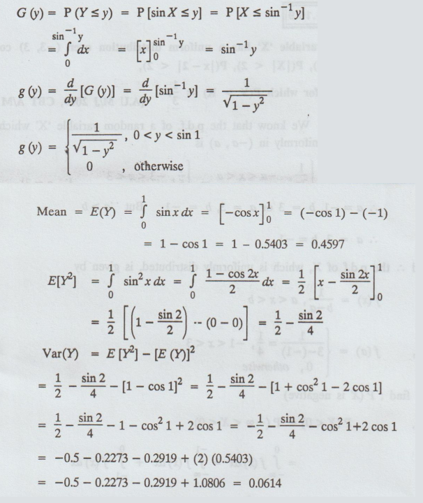 If X is a random variable uniformly distributed in (0, 1), find the pdf of Y = sin x. Also find the mean and variance of Y.